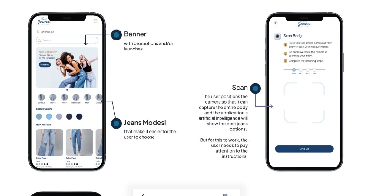 A solução adotada consistiu na criação de um aplicativo com inteligência artificial capaz de escanear o corpo, oferecendo modelos de jeans que harmonizam idealmente com as medidas corporais. Dessa forma, evitamos a possibilidade de não encontrar o jeans perfeito para cada tipo de corpo.