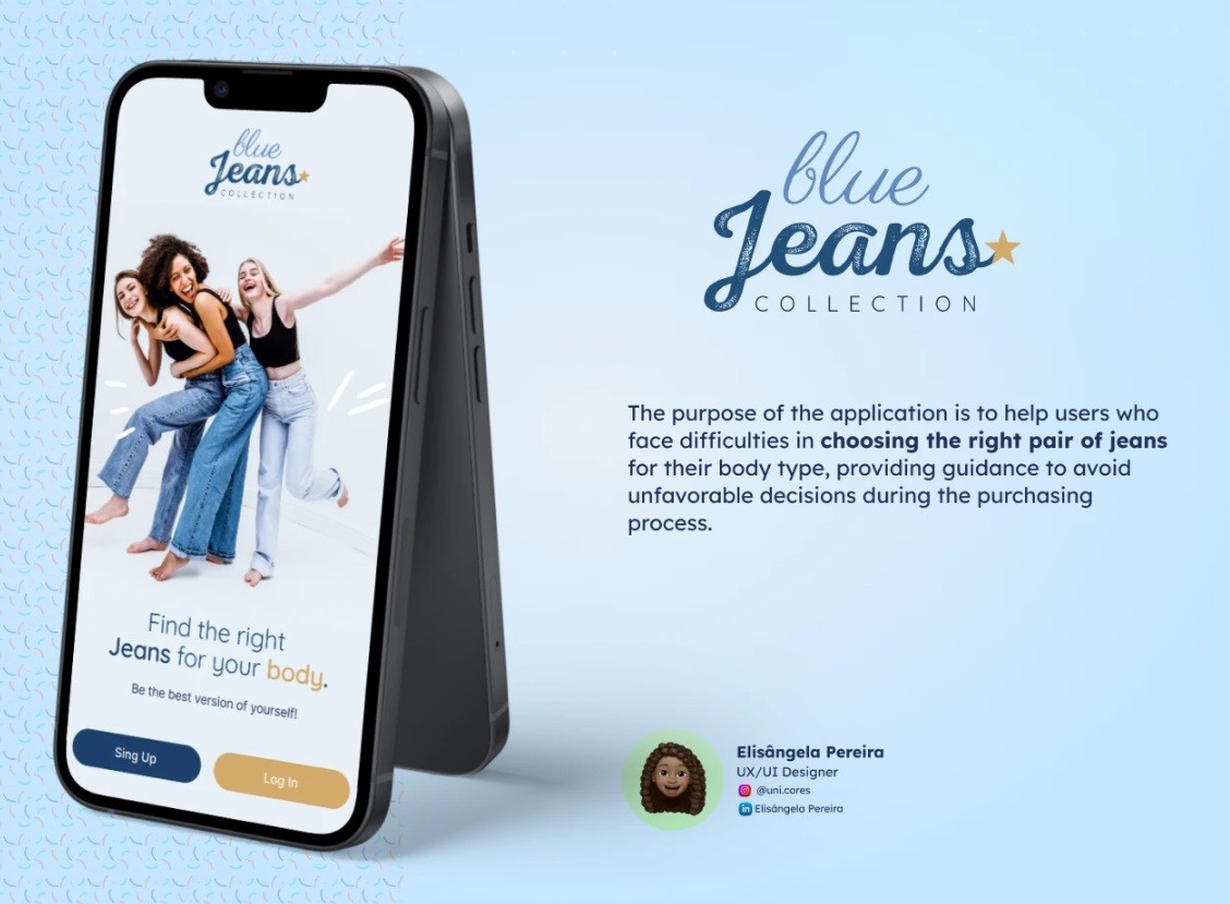 O objetivo da aplicação é ajudar usuários que enfrentam dificuldades em escolher o par de jeans certo para o seu tipo de corpo, oferecendo orientação para evitar decisões desfavoráveis durante o processo de compra.